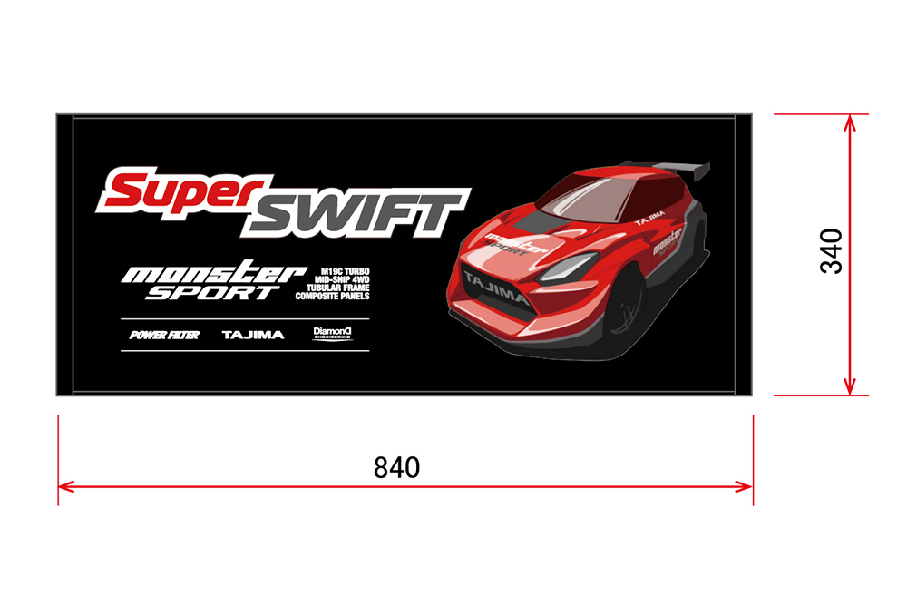 MONSTER SPORTがスイフトスポーツファイナルエディションの登場を受けて提示する究極のスイフトスポーツ『スーパースイフト 2026』。 そのスーパースイフトを実車さながらの迫力と躍動感あるイラストで再現したフェイスタオルです。