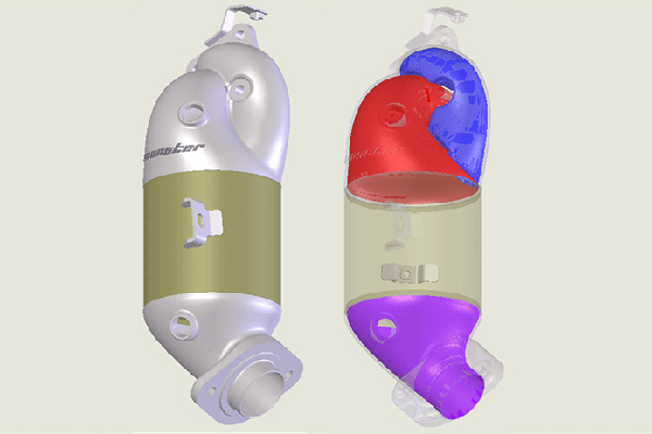 - ノーマルのセラミック触媒に対し、本品は国産高効率タイプの大径ハニカムメタル触媒を採用。排気抵抗を徹底的に低減させるとともに、必要な排ガス浄化性能を両立。